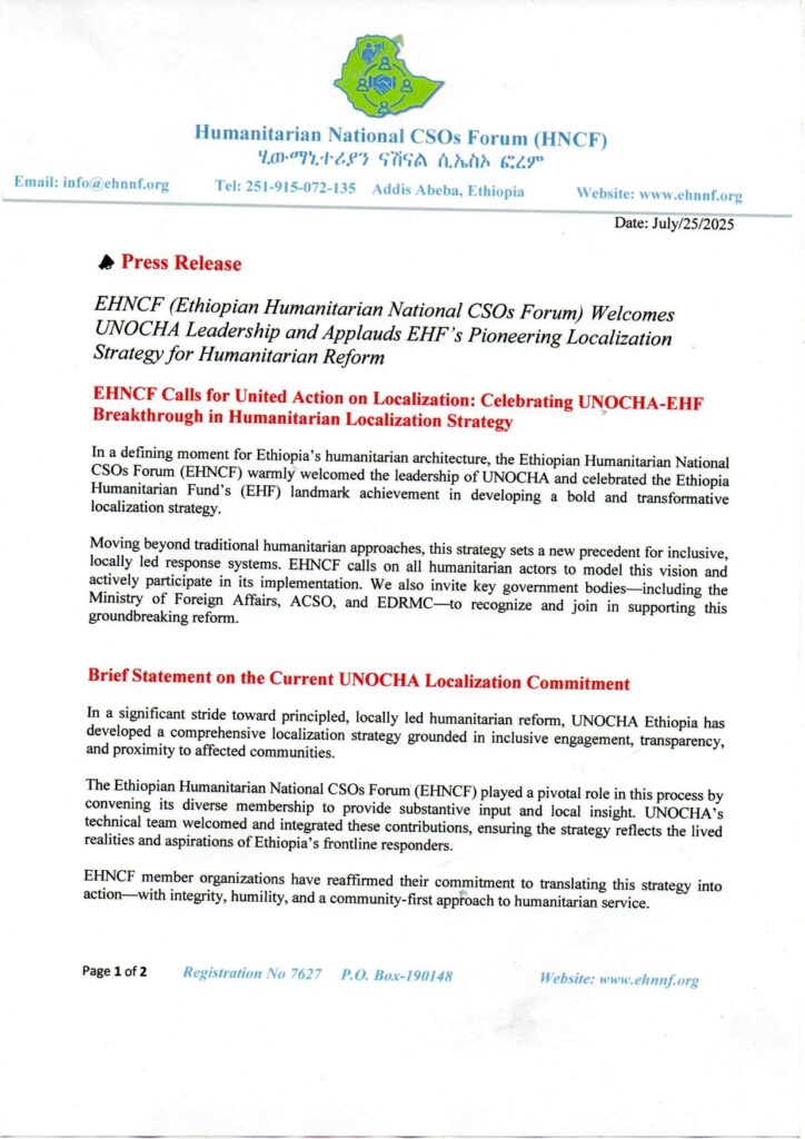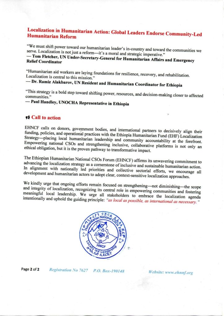 The Ethiopian Humanitarian National CSOs Forum (EHNCF) affirms its unwavering commitment to advancing the localization strategy as a cornerstone of inclusive and sustainable humanitarian action. In alignment with nationally led priorities and collective sectorial efforts, we encourage all development and humanitarian actors to adopt clear, context-sensitive localization approaches.